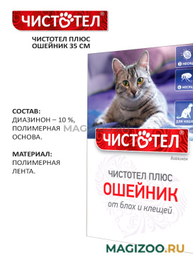 ЧИСТОТЕЛ ПЛЮС ошейник применяют для уничтожения блох, вшей, власоедов и иксодовых клещей, паразитирующих на кошках. Постоянное ношение ошейника обеспечивает защиту от иксодовых клещей на протяжении 3 месяцев, от насекомых - на протяжении 4 месяцев.