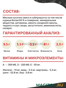 Мясные кусочки (мясо и субпродукты (в том числе курица более 60 % и говядина), минеральные вещества, витамины, мякоть сахарной свеклы, таурин) и соус (вода, загустители, аминокислоты, сахара).