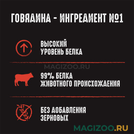 Отличный вариант с говядиной плотное желе, аромат натурального мяса. Собака ест с огромным аппетитом, даже не принюхивается, сразу приступает. По составу все честно, без зерна и искусственных добавок. Настоящее мясо, и это видно по реакции питомца!