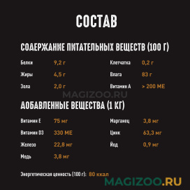 Пищевые добавки (на 1 кг): Витамин А - > 200 МЕ, витамин D3 – 330 МЕ, цинк - 63,3 мг, витамин Е – 75 мг, марганец – 3,8 мг, медь – 3,8 мг, йод – 0,9 мг, железо – 22,8 мг.
