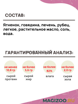 Ягненок, говядина, печень, рубец, легкое, растительное масло, соль, вода.