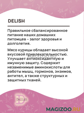 Рационы Delish производятся по особой рецептуре, где сочетаются пожелания и требования заводчиков. Основа кормов – измельченное и высушенное мясо.