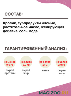 Кролик, субпродукты мясные, растительное масло, желирующая добавка, соль, вода.