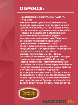 ДЕРЕВЕНСКИЕ ЛАКОМСТВА – бренд российской компании «Адресник», которая появилась на рынке в 2006 г. С тех пор многое изменилось. Меняются привычки, потребности, вкусы. Ставя перед собой цель помогать людям в их каждодневных заботах о питомцах, компания «Адресник» использует все средства, чтобы идти в ногу со временем: в компании разрабатываются новые торговые марки, совершенствуются уже существующие бренды, налаживаются более эффективные способы производства.