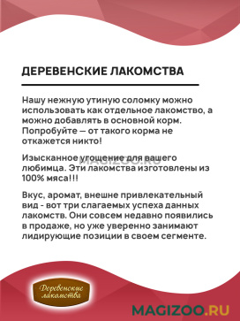 Нашу нежную утиную соломку можно использовать как отдельное лакомство, а можно добавлять в основной корм. Попробуйте — от такого корма не откажется никто!