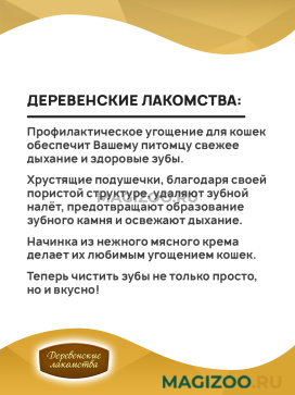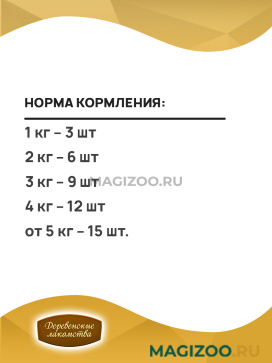 Информация о составе и ингредиентах, цветовом решении, технических и иных характеристиках, стране-изготовителе, внешнем виде и комплекте поставки товара носит справочный характер и основана на последних доступных к моменту публикации сведениях. Доставка данного товара осуществляется во все регионы РФ.Именно так рассуждали производители, создавая продукцию под торговой маркой ДЕРЕВЕНСКИЕ ЛАКОМСТВА. В основе этих лакомств лежат традиции поощрения собак и кошек, совмещенные с современными знаниями в области ветеринарии и здорового питания животных. У каждого домашнего животного свои вкусы и предпочтения. Именно поэтому ассортимент разделен на группы, чтобы каждый хозяин мог легко найти подходящее лакомство для своего питомца!