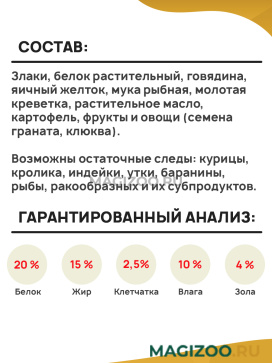 Злаки, белок растительный, говядина, яичный желток, мука рыбная, молотая креветка, растительное масло, картофель, фрукты и овощи (семена граната, клюква).