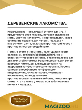 Помимо этого, смесь мяты, календулы и корня солодки имеет противовоспалительное и спазмолитическое свойства, а также полезно для дыхательной системы. Рекомендовано для более взрослых питомцев, для поддержания их здоровья и комфортного самочувствия. Корень солодки способствует комфортному пищеварению, очищает кровь, уменьшает воспаление; календула имеет противовоспалительные свойства, помогает при стоматите и ангине у кошек, при заболеваниях печени и желудка.