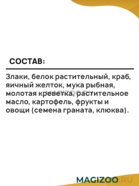 Злаки, белок растительный, краб, яичный желток, мука рыбная, молотая креветка, растительное масло, картофель, фрукты и овощи (семена граната, клюква).