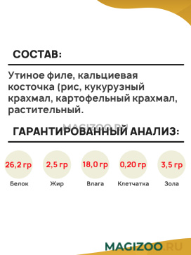 Утиное филе, кальциевая косточка (рис, кукурузный крахмал, картофельный крахмал, растительный.