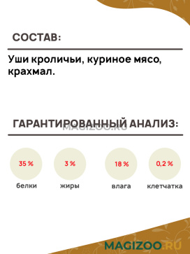 Комбинация хрустящих кроличьих ушек с нежным мясом цыпленка создают уникальное лакомство, которое не только придется по вкусу любой собаке, но и заставит ее немного потрудиться!