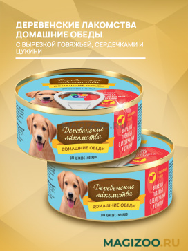 Мясные полнорационные консервы «ДОМАШНИЕ ОБЕДЫ» для собак – это питательно, вкусно и полезно. Только самое свежее мясо, только отборные и любимые Вашим четвероногим другом субпродукты, только самые полезные и богатые витаминами овощи входят в состав этого корма!