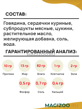 Говядина, сердечки куриные, субпродукты мясные, цукини, растительное масло, желирующая добавка, соль, вода.