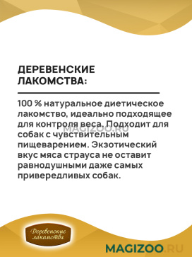 100 % натуральное диетическое лакомство, идеально подходящее для контроля веса. Подходит для собак с чувствительным пищеварением. Экзотический вкус мяса страуса не оставит равнодушными даже самых привередливых собак.