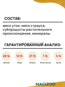 Состав: мясо утки, мясо страуса, субпродукты растительного происхождения, минералы.