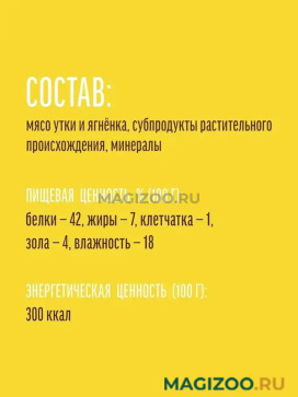 Состав: мясо утки, мясо ягненка, субпродукты растительного происхождения, минералы.