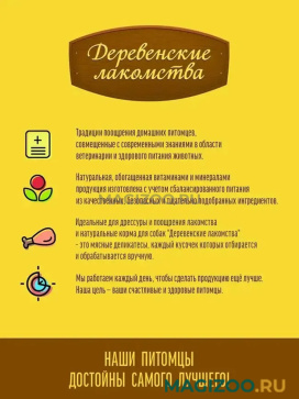 Именно так рассуждали производители, создавая продукцию под торговой маркой ДЕРЕВЕНСКИЕ ЛАКОМСТВА. В основе этих лакомств лежат традиции поощрения собак и кошек, совмещенные с современными знаниями в области ветеринарии и здорового питания животных. У каждого домашнего животного свои вкусы и предпочтения. Именно поэтому ассортимент разделен на группы, чтобы каждый хозяин мог легко найти подходящее лакомство для своего питомца!