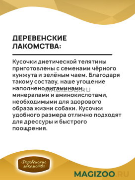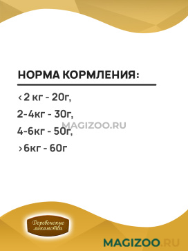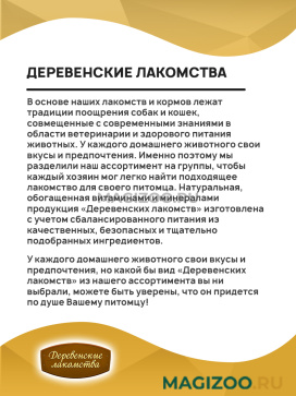 Информация о составе и ингредиентах, цветовом решении, технических и иных характеристиках, стране-изготовителе, внешнем виде и комплекте поставки товара носит справочный характер и основана на последних доступных к моменту публикации сведениях. Доставка данного товара осуществляется во все регионы РФ.Именно так рассуждали производители, создавая продукцию под торговой маркой ДЕРЕВЕНСКИЕ ЛАКОМСТВА. В основе этих лакомств лежат традиции поощрения собак и кошек, совмещенные с современными знаниями в области ветеринарии и здорового питания животных. У каждого домашнего животного свои вкусы и предпочтения. Именно поэтому ассортимент разделен на группы, чтобы каждый хозяин мог легко найти подходящее лакомство для своего питомца!