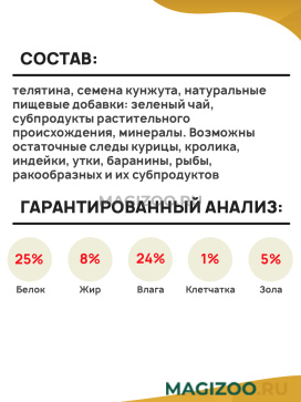 Состав: телятина, семена кунжута, натуральные пищевые добавки: зеленый чай, субпродукты растительного происхождения, минералы. Возможны остаточные следы курицы, кролика, индейки, утки, баранины, рыбы, ракообразных и их субпродуктов