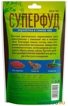 Кусочки диетического перепелиного мяса приготовлены с семенами чиа и зелёным чаем. Благодаря такому составу, наше угощение наполнено витаминами, минералами и аминокислотами, необходимыми для здорового образа жизни собаки. Кусочки удобного размера отлично подходят для дрессуры и быстрого поощрения.