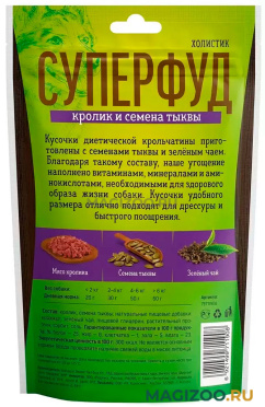 Кусочки диетической крольчатины приготовлены с семенами тыквы и зелёным чаем. Благодаря такому составу, наше угощение наполнено витаминами, минералами и аминокислотами, необходимыми для здорового образа жизни собаки. Кусочки удобного размера отлично подходят для дрессуры и быстрого поощрения.