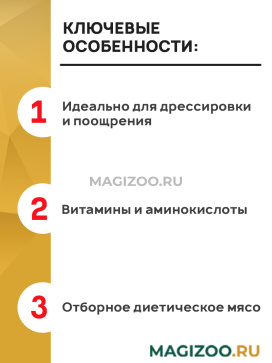 Кусочки диетического мяса индейки приготовлены с семенами льна и зелёным чаем. Благодаря такому составу, наше угощение наполнено витаминами, минералами и аминокислотами, необходимым для здорового образа жизни собаки. Кусочки удобного размера отлично подходят для дрессуры и быстрого поощрения.