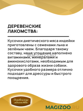 Информация о составе и ингредиентах, цветовом решении, технических и иных характеристиках, стране-изготовителе, внешнем виде и комплекте поставки товара носит справочный характер и основана на последних доступных к моменту публикации сведениях. Доставка данного товара осуществляется во все регионы РФ.Именно так рассуждали производители, создавая продукцию под торговой маркой ДЕРЕВЕНСКИЕ ЛАКОМСТВА. В основе этих лакомств лежат традиции поощрения собак и кошек, совмещенные с современными знаниями в области ветеринарии и здорового питания животных. У каждого домашнего животного свои вкусы и предпочтения. Именно поэтому ассортимент разделен на группы, чтобы каждый хозяин мог легко найти подходящее лакомство для своего питомца!