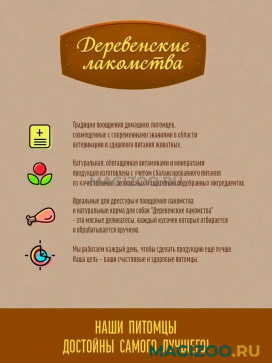 Информация о составе и ингредиентах, цветовом решении, технических и иных характеристиках, стране-изготовителе, внешнем виде и комплекте поставки товара носит справочный характер и основана на последних доступных к моменту публикации сведениях. Доставка данного товара осуществляется во все регионы РФ.Именно так рассуждали производители, создавая продукцию под торговой маркой ДЕРЕВЕНСКИЕ ЛАКОМСТВА. В основе этих лакомств лежат традиции поощрения собак и кошек, совмещенные с современными знаниями в области ветеринарии и здорового питания животных. У каждого домашнего животного свои вкусы и предпочтения. Именно поэтому ассортимент разделен на группы, чтобы каждый хозяин мог легко найти подходящее лакомство для своего питомца!