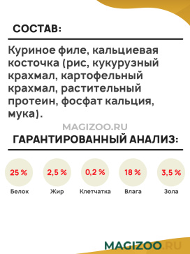 Куриное филе, кальциевая косточка (рис, кукурузный крахмал, картофельный крахмал, растительный протеин, фосфат кальция, мука).