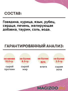 Говядина, курица, язык, рубец, сердце, печень, желирующая добавка, таурин, соль, вода.