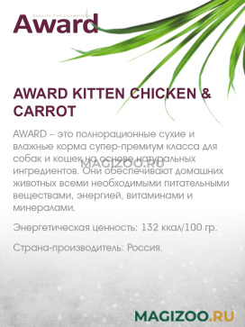 AWARD - это не просто корм, это функциональные рецептуры, которые работают. Выбирая AWARD, Вы выбираете осознанный подход к питанию Вашего питомца!