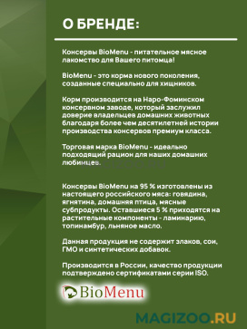 Консервы BioMenu на 95 % изготовлены из настоящего российского мяса: говядина, ягнятина, домашняя птица, мясные субпродукты. Оставшиеся 5 % приходятся на растительные компоненты - ламинарию, топинамбур, льняное масло.