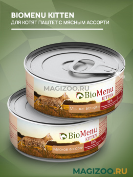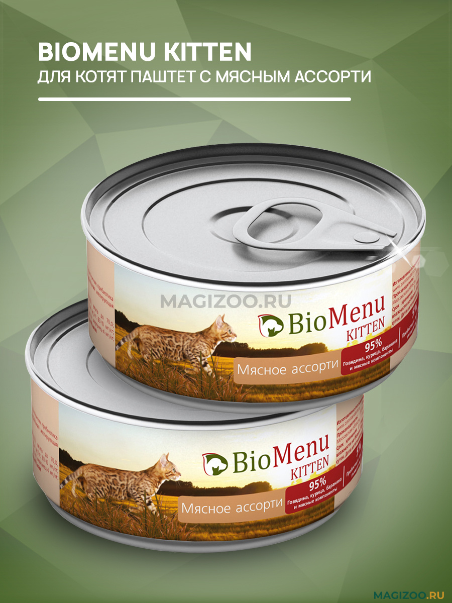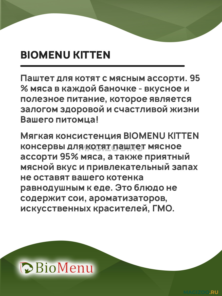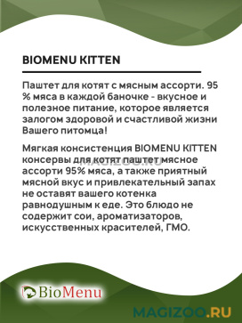 Мягкая консистенция BIOMENU KITTEN консервы для котят паштет мясное ассорти 95% мяса, а также приятный мясной вкус и привлекательный запах не оставят вашего котенка равнодушным к еде. Это блюдо не содержит сои, ароматизаторов, искусственных красителей, ГМО.