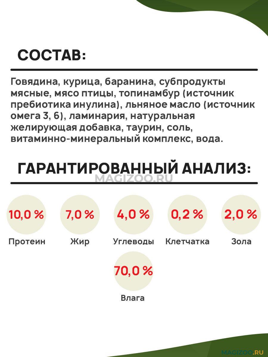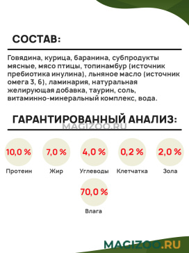 Говядина, курица, баранина, субпродукты мясные, мясо птицы, топинамбур (источник пребиотика инулина), льняное масло (источник омега 3, 6), ламинария, натуральная желирующая добавка, таурин, соль, витаминно-минеральный комплекс, вода.