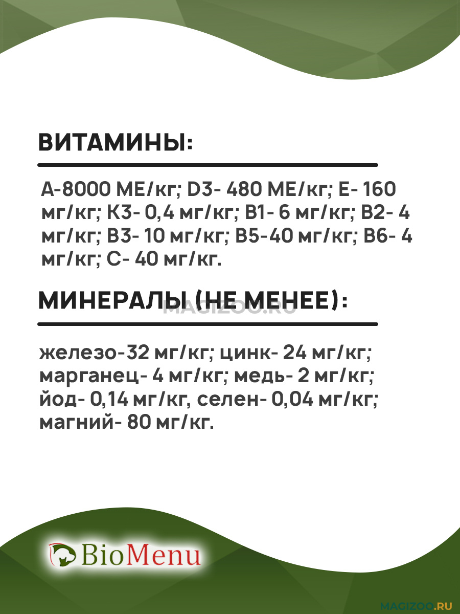 Минералы (не менее): железо-32 мг/кг; цинк- 24 мг/кг; марганец- 4 мг/кг; медь- 2 мг/кг; йод- 0,14 мг/кг, селен- 0,04 мг/кг; магний- 80 мг/кг.