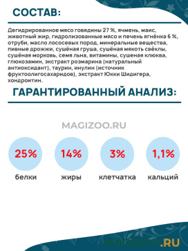 Дегидрированное мясо говядины 27 %, ячмень, маис, животный жир, гидролизованные мясо и печень ягнёнка 6 %, отруби, масло лососевых пород, минеральные вещества, пивные дрожжи, сушёная груша, сушёная мякоть свёклы, сушёная морковь, семя льна, витамины, сушеная клюква, глюкозамин, экстракт розмарина (натуральный антиоксидант), таурин, инулин (источник фруктоолигосахаридов), экстракт Юкки Шидигера, хондроитин.