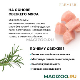 - Свежее мясо без костей. В составе используется свежее мясо высшего сорта, изначально пригодное для употребления человеком. Это гарантирует, что Ваш питомец получает высокопитательный, чрезвычайно вкусный, легко усвояемый высококачественный источник белка.