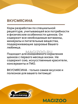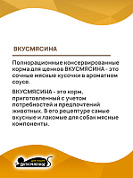 ВКУСМЯСИНА - это корм, приготовленный с учетом потребностей и предпочтений животных. В его рецептуре самые вкусные и лакомые для собак мясные компоненты.