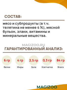 Состав: мясо и субпродукты (в т.ч. телятина не менее 4 %), мясной бульон, злаки, витамины и минеральные вещества.