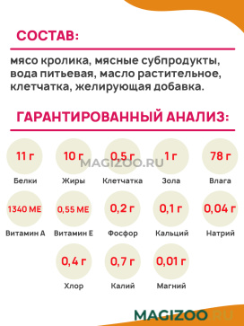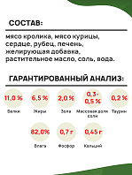 Состав: мясо кролика, мясные субпродукты, вода питьевая, масло растительное, клетчатка, желирующая добавка.