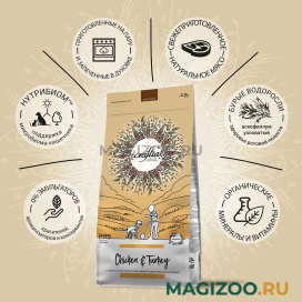 Сырая курица (20%), сырая индейка (16%), дегидратированный куриный белок (12%), дегидратированный белок индейки (10%), куриный жир, гидролизованные белки птицы (курица, индейка), гидролизованный рыбий белок (треска, пикша), рыбий жир (лососевый), спельта, бурый рис, ячмень, овес, просо, куриные потроха (печень, сердце, почки), куриные хрящи (источник глюкозамина и хондроитина сульфата), сухое яйцо (куриное), льняное семя, сухая свекольная пульпа, люцерновая мука, волокна гороха, сушеная клюква (0,5%), сушеная ацерола (0,5%), сушеная черника, сушеная спаржа, инулин цикория (0,4%), дрожжевой экстракт (источник маннанолигосахаридов) (0,3%), фруктоолигосахариды (0,3%), аскофиллум узловатый (Ascophyllum Nodosum), карбонат кальция, монокальцийфосфат, хлорид калия, хлорид натрия, сухие пивные дрожжи, алоэ вера, розмарин, куркума, календула, семена и шелуха подорожника, юкка Шидигера.