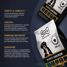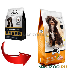 - Gina Puppy Chicken производится без синтетических и натуральных красителей, без добавления аминокислот, генетически модифицированных продуктов, усилителей вкуса и ароматов.