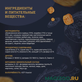 Обезвоженное мясо курицы – 15 %, индейки – 11 % и тунца – 5 %, рис, кукуруза, куриный жир, растительные масла холодного отжима, рыбий жир, льняное семя, свекловичная стружка, гидролизованная печень, пивные дрожжи, инулин (экстракт цикория), MOS (дрожжевой экстракт), лецитин, юкка Шидигера.