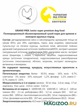 Корм Grand Prix Large Junior для щенков собак крупных пород содержит оптимальный набор полезных веществ и микроэлементов для здорового роста и правильного развития щенков и юниоров.