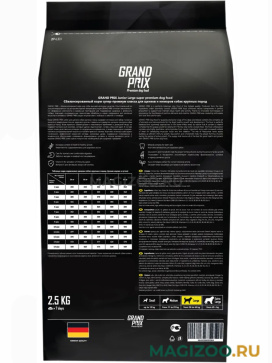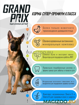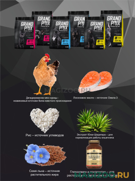 GRAND PRIX – корма для собак и кошек высшей категории качества. Очень важно, чтобы питомец получал с кормом полноценный набор питательных веществ и витаминов, ведь именно благодаря пище закладывается фундамент его здоровья. Полностью сбалансированное питание, обеспечивающее питомца полноценным набором жизненно важных элементов с основой из качественных белков и углеводов - залог его здоровья и красоты.