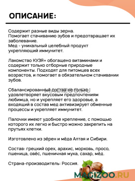 Лакомство КУЗЯ+ обогащено витаминами и содержит только отборные природные компоненты. Подходят для питомцев всех возрастов, и помогает в обязательном стачивании зубов.