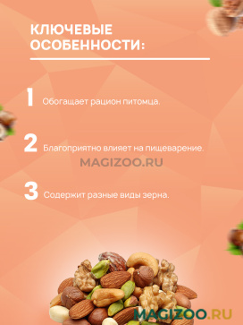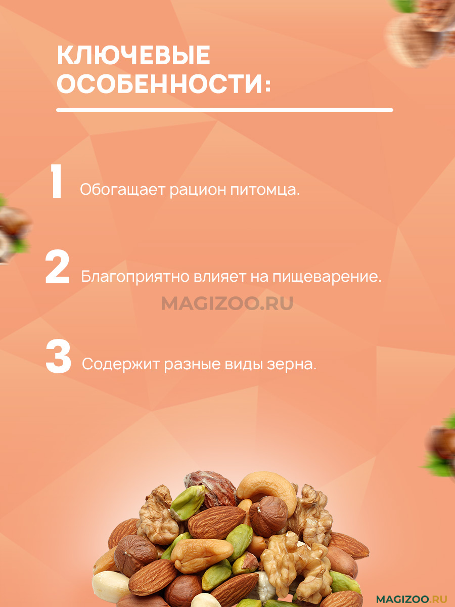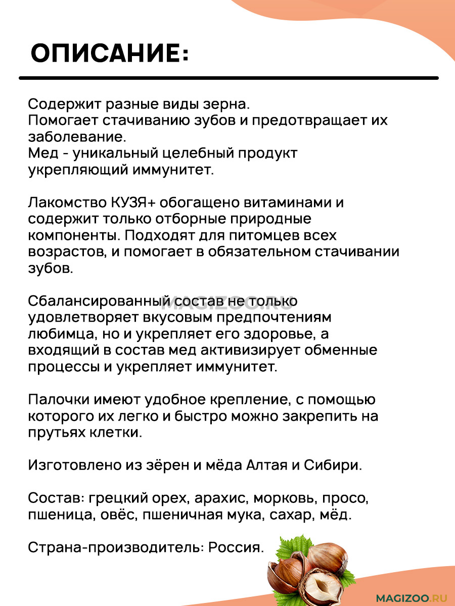 Состав: грецкий орех, арахис, морковь, просо, пшеница, овёс, пшеничная мука, сахар, мёд.