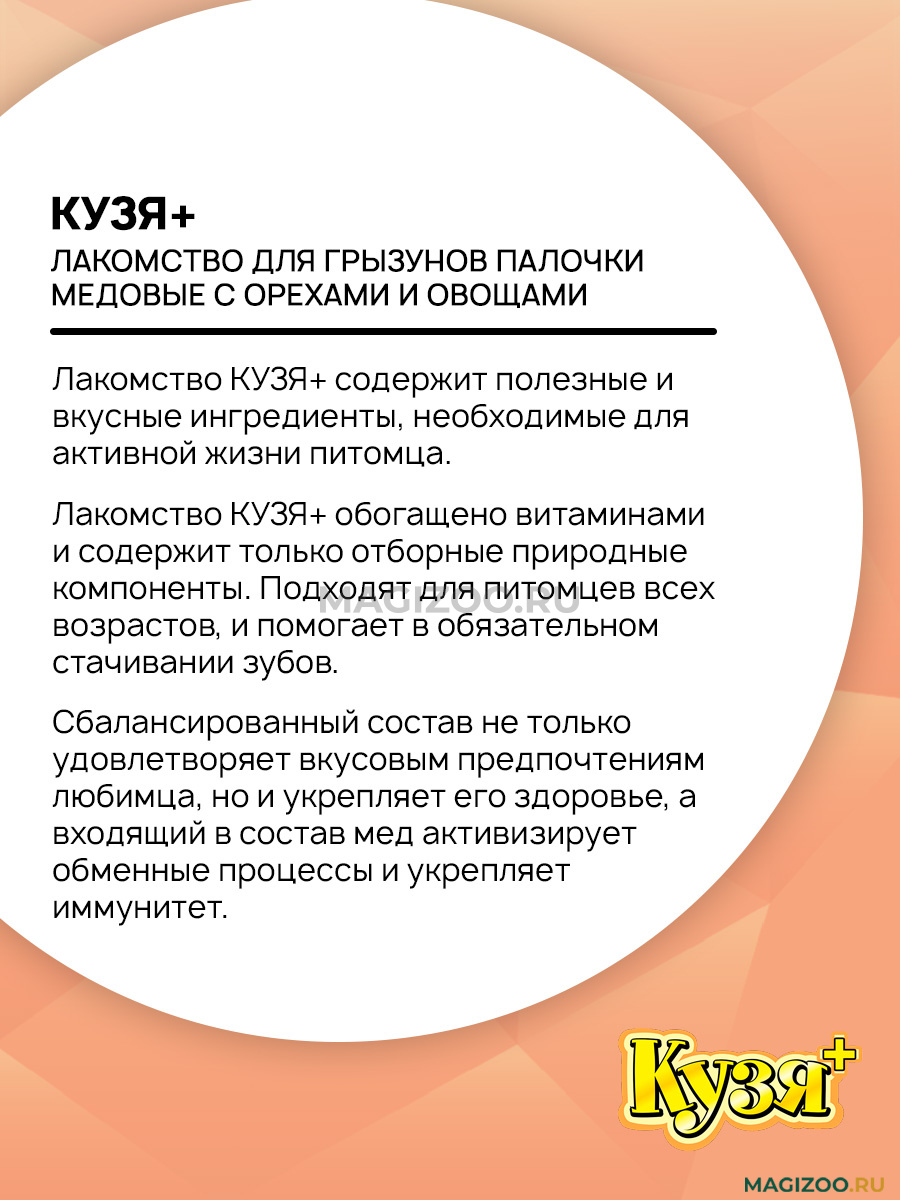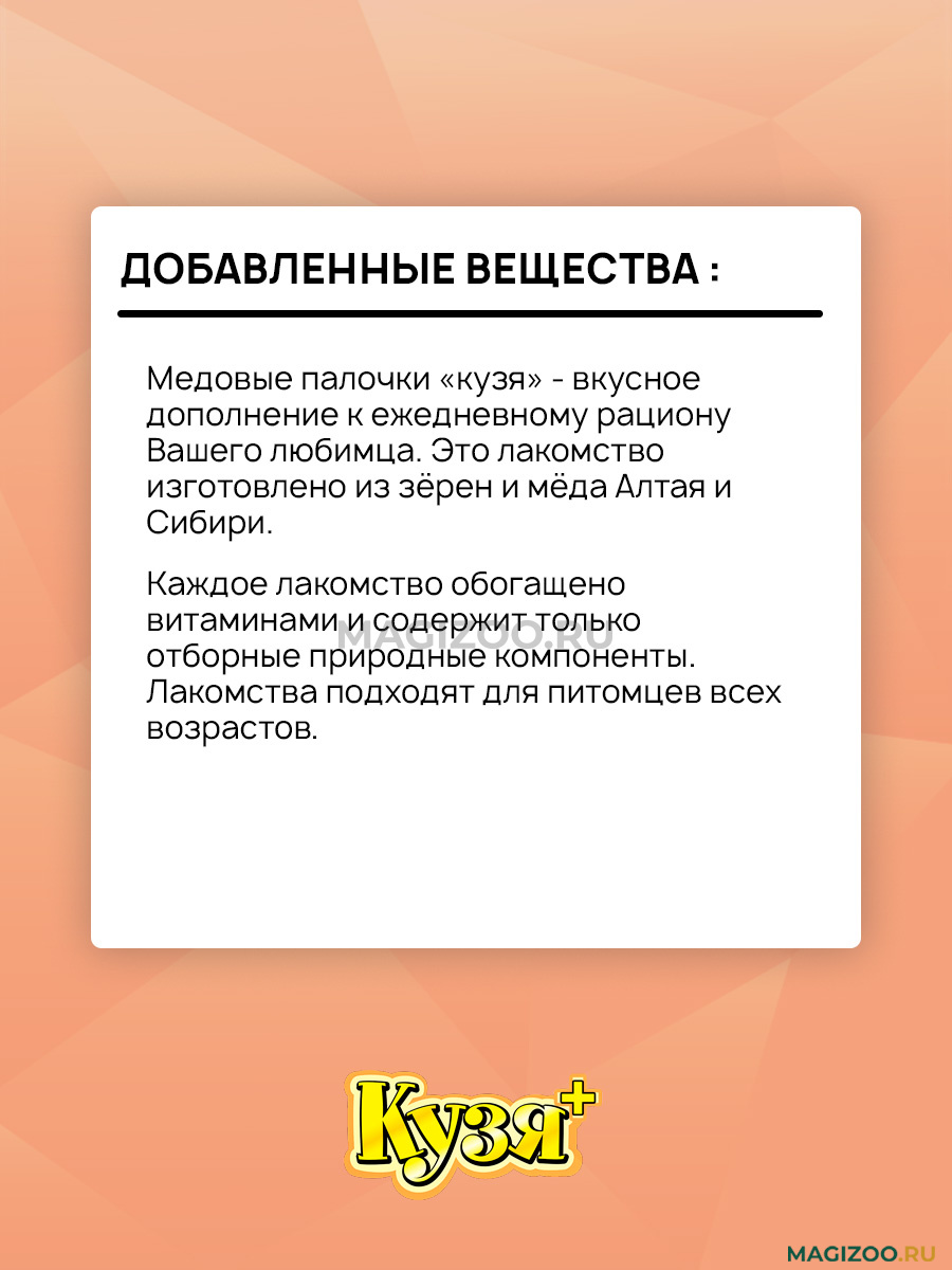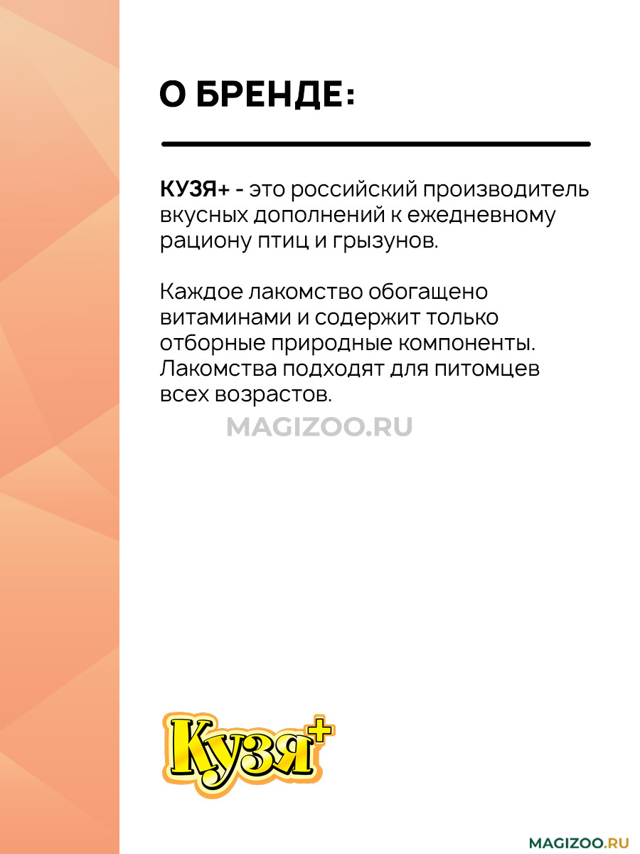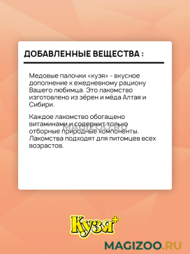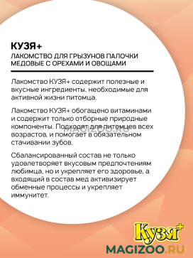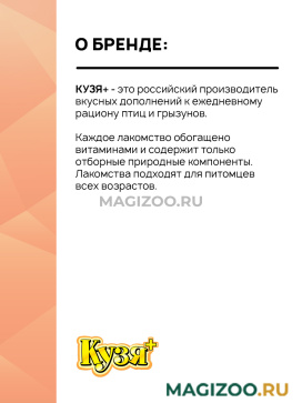 Лакомство КУЗЯ+ содержит полезные и вкусные ингредиенты, необходимые для активной жизни питомца.