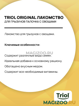 TRIOL – собственная торговая марка компании AMMA, существующая с 2004 года. Являясь одним из крупнейших в России поставщиков зоотоваров, произведенных на самых современных заводах и фабриках Юго-Восточной Азии, компания AMMA с более чем 20-летним опытом деятельности контролирует каждый этап производства продукции. Благодаря постоянному совершенствованию линии товаров, продукция TRIOL – это огромный ассортимент аксессуаров и лакомств для животных!