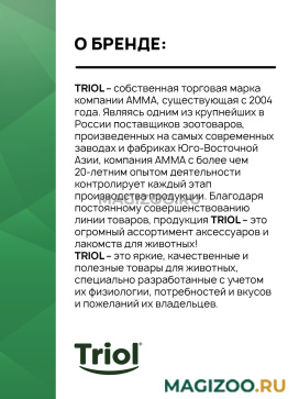 TRIOL – собственная торговая марка компании AMMA, существующая с 2004 года. Являясь одним из крупнейших в России поставщиков зоотоваров, произведенных на самых современных заводах и фабриках Юго-Восточной Азии, компания AMMA с более чем 20-летним опытом деятельности контролирует каждый этап производства продукции. Благодаря постоянному совершенствованию линии товаров, продукция TRIOL – это огромный ассортимент аксессуаров и лакомств для животных!